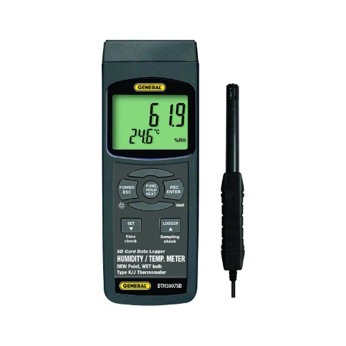 Data Logging Thermo-Hygrometer W/ Excel Formatted SD Card?Data Logging Thermo-Hygrometer W/ Excel Formatted SD Card This is a new data logging thermo-hygrometer Four-function instrument measures temperature/humidity, dew point, wet-bulb temperature and surface temperature Big (2.5 in. diagonal) front-panel green backlit LCD is easy to read Displays maximum and minimum readings and holds any reading Automatically logs measurements at sampling time settable from one second to one hour Also supports manual data logging and changing of SD card storage location Auto power off function Display: 2.05" x 1.5" (52 x 38mm) LCD Parameters Measured: Temperature, relative humidity (R.H.), dew point, wet-bulb temperature Measurement Range: For temperature: 32 degrees to 122 degreesF (0 degrees to 50 degreesC) For R.H.: 5 to 95% For dew point: -13.5 degrees to 120.1 degreesF (-25.3 degrees to 48.9 degreesC) For wet-bulb temperature: -6.9 degrees to 122 degreesF (-21.6 degrees to 50 degreesC) Measurement Accuracy: ± 1.5 degreesF (± 0.8 degreesC) for temperature Sum of temperature and humidity accuracies for dew point and wet-bulb temperature Storable/Recallable Readings: Min/Max Operating Temperature: 32 degrees to 122 degreesF (0 degrees to 50 degrees C) Operating Relative Humidity: 0 to 85% Dimensions of Meter: 6.97" x 2.68" x 1.77" (177 x 68 x 45mm) Power Source: 6 â??AAâ? batteries or optional 9-VDC AC adapter Includes soft carrying case, Temperature-humidity probe, 2 GB SD memory card and user's manual