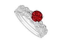 Ruby and Diamond Engagement Ring with Wedding Band Set : 14K White Gold - 0.50 CT TGW Size 7?These gorgeous engagement ring and wedding band set with round ruby prong-set atop in the center. Both side are accentuated by smaller brilliant-cut diamonds along with matching wedding band to make a perfect set of ring. Edges are detailed with fine milgrain work. Made in 14K white gold & has a total diamond weight (TGW) of engagement ring is 0.40 carat and wedding band as 0.10 carat...Please note: Normal shipping time is for the average ring size (Women - size 6, Men - size 10). If you order a different size, the ring will be custom made to that size and will take longer for shipping.......Please note: Normal shipping time is for the average ring size (Women - size 6, Men - size 10). If you order a different size, the ring will be custom made to that size and will take longer for shipping...